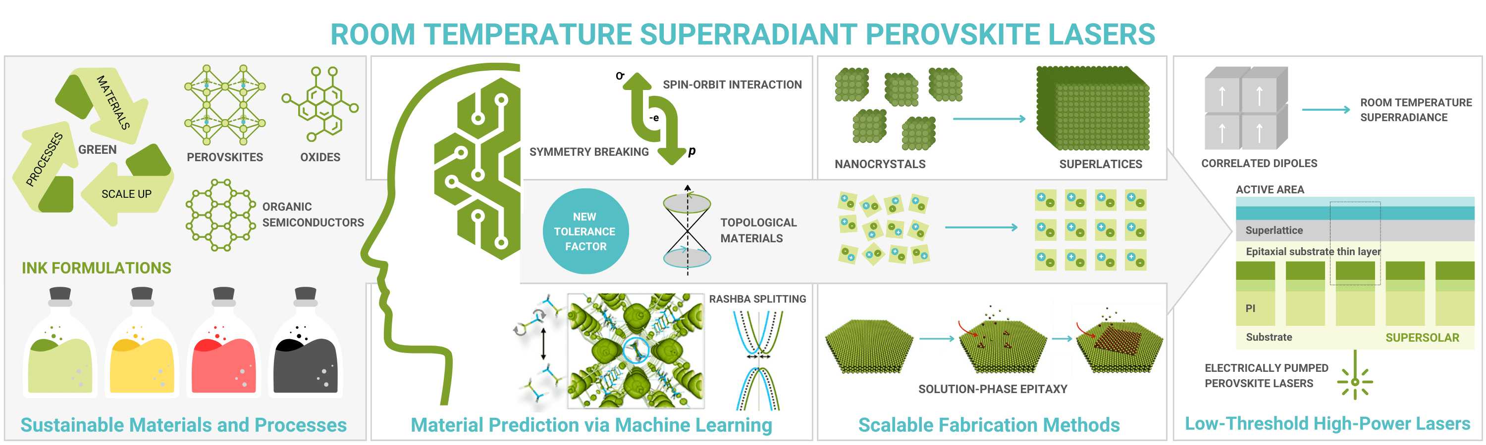 The primary and most ambitious goal of this project is to achieve, for the first time, electrically driven perovskite lasers. This will be accomplished through a holistic material and device fabrication approach aimed at maximising optical gain, enhancing carrier injection efficiency, minimising parasitic capacitance, and improving the system's tolerance to Joule heating. A comprehensive strategy will be employed to design and optimise perovskite laser diodes, utilising solution-based fabrication methods. The ultimate objective is to develop electrically excited perovskite lasers capable of stable operation at room temperature, including both superradiant laser sources and conventional laser diodes.